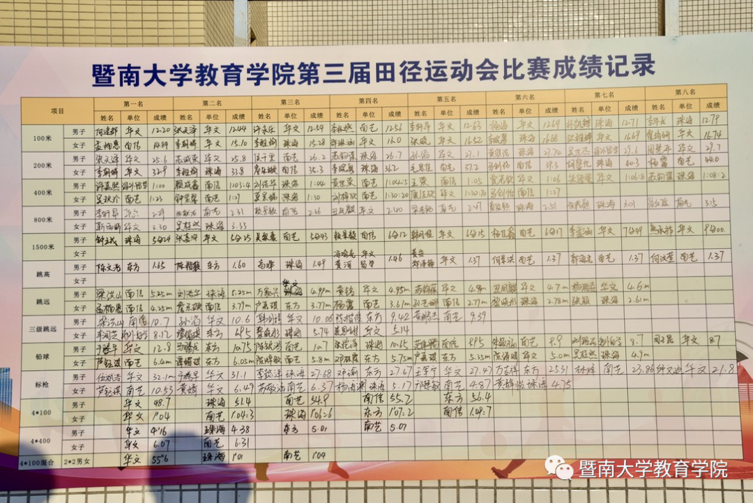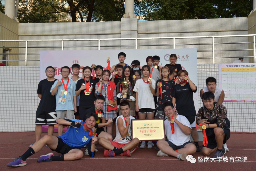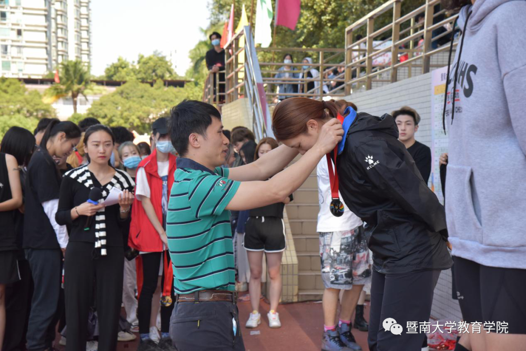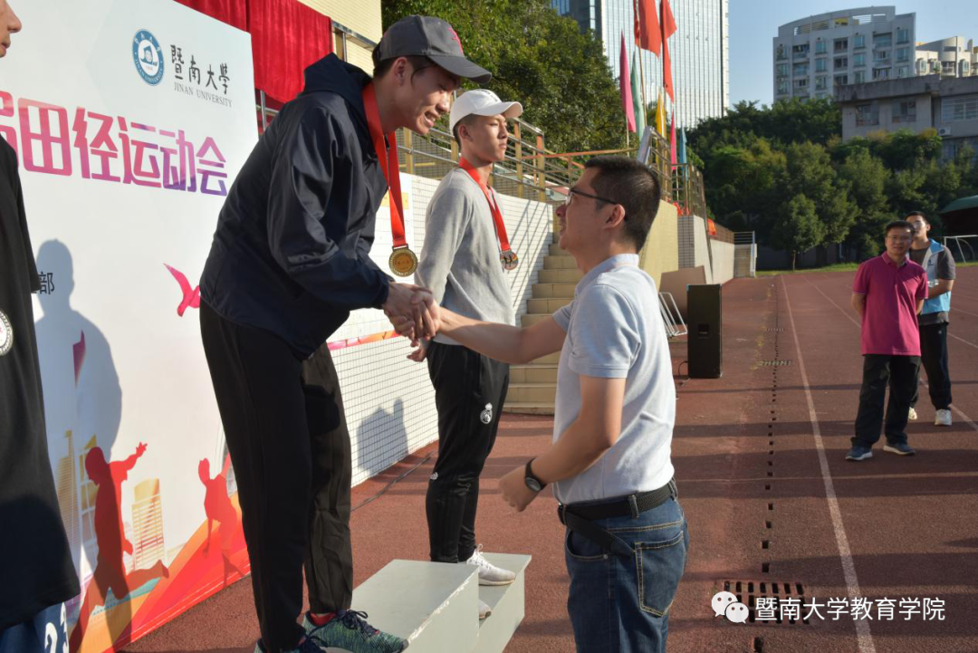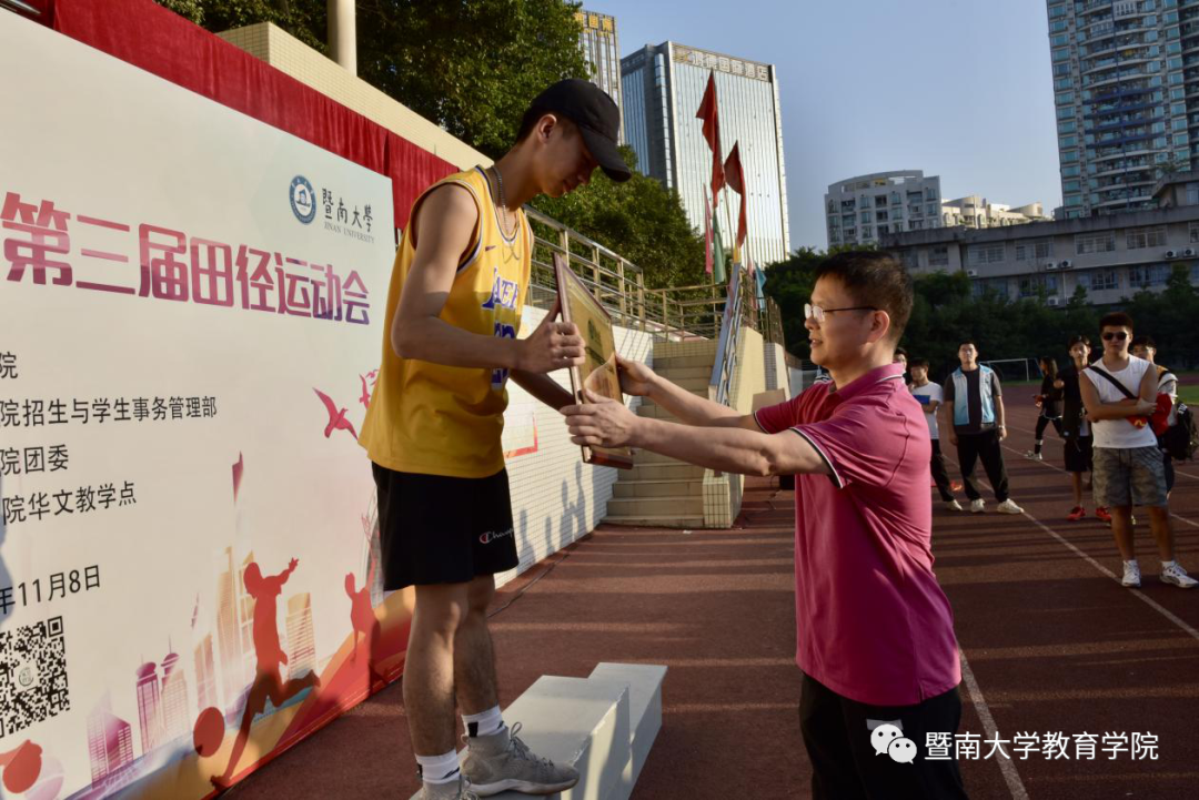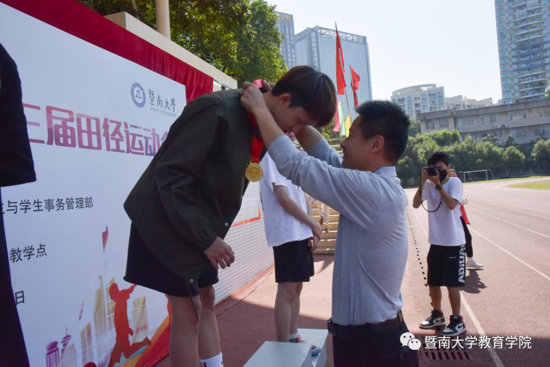 经过一天紧张激烈的角逐,我院第三届田径运动会圆满完成各项赛事正式落下帷幕。暨南大学教育学院党委副书记郑凡强、副院长曾牧、招生与学生事务管理部副主任欧传峰、团委书记栗万里出席了闭幕式,并为获奖教学点颁奖。最终,暨南大学中大科教教学点获得了团体总分第一名和特殊贡献奖、南艺教学点获得了团体总分第二名和最佳组织奖、珠海社科教学点获得了团体总分第三名和最佳风采奖、南方信息中心教学点获得了体育道德风尚奖、东方标准教学点获得了精神文明奖。